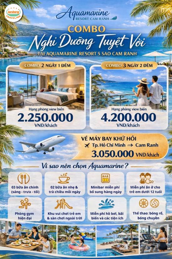 Trang chủ COMBO NGHỈ DƯỠNG TUYỆT VỜI TẠI AQUAMARINE REORT 5 SAO CAM RANHTÌM TOUR Loại tour Tour nước ngoài Tour trong nướcTìm KiếmLiên hệ CÔNG TY TNHH THƯƠNG MẠI DU LỊCH LIÊN BANG Địa chỉ : 101 Trần Hưng Đạo, Phường Cầu Ông Lãnh, TP. Hồ Chí Minh Số điện thoại : (028) 3838 2288 Fax : (028) 3838 2299 Email : info@lienbangtravel.com Website : new.lienbangtravel.com Kết nối mạng xã hội với DU LỊCH LIÊN BANG COMBO NGHỈ DƯỠNG TUYỆT VỜI TẠI AQUAMARINE REORT 5 SAO CAM RANH CÁC TIN LIÊN QUAN KHÁM PHÁ NAM DU COMBO HÈ 2026: SUỐI KHOÁNG MINERA BÌNH CHÂU COMBO MÙA HÈ 2026: SEAVA HỒ TRÀM COMBO HÈ 2026: CENTARA MŨI NÉ MŨI NÉ - ASTERIA COSTA BELLA