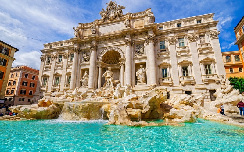 - Đài phun nước Trevi: là đài phun nước lớn nhất và đẹp nhất ở Rome, với chiều cao 26 mét, rộng 50 mét. Được xây dựng trong 30 năm, từ năm 1932 -1962 bởi hai kiến trúc sư Nicola Salvi và Giuseppe Pannini, đài phun nước khoác trên mình phong cách kiến trúc Baroque. Tổng thế Trevi được làm từ đá vôi và đá cẩm thạch Carrara. Sẽ thật thiếu sót khi nhắc tới Trevi mà không nhắc đến thói quen tung đồng xu để cầu may mắn, ước nguyện. Theo truyền thuyết, ném 1 đồng xu khi bạn muốn quay trở lại thành Rome.