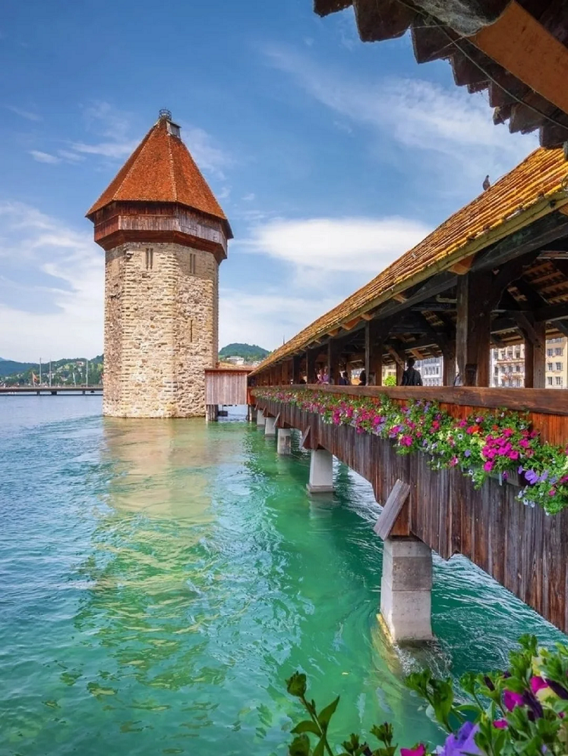 - Cầu gỗ Chapel – biểu tượng độc đáo của thành phố Lucerne, với chiều dài 205m hoàn toàn bằng gỗ với hình zic zac, ở giữa có tháp nước bằng đá, hai bên thành cầu mùa hè được trang trí bằng hàng loạt chậu hoa phong lữ xinh xắn.