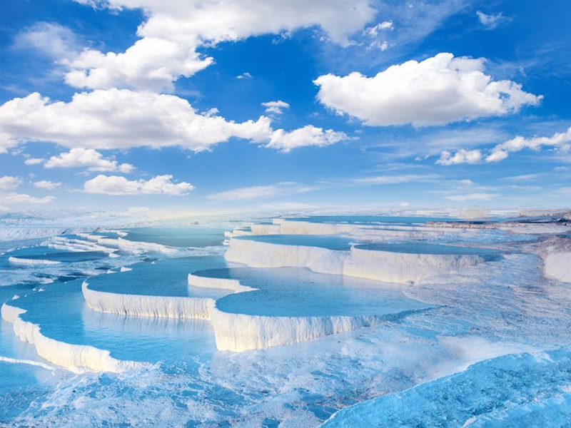 - Lâu đài bông Pamukkale: là một kỳ quan thiên nhiên tuyệt đẹp ở Thổ Nhĩ Kỳ, nổi tiếng với những bậc thang đá vôi trắng xóa và suối nước nóng khoáng. Pamukkale, có nghĩa là “lâu đài bông” trong tiếng Thổ Nhĩ Kỳ. Khu vực này nổi tiếng với những bậc thang trắng được tạo thành từ đá travertine, một loại đá trầm tích lắng đọng bởi nước từ mười bảy suối nước nóng tự nhiên ở đây.