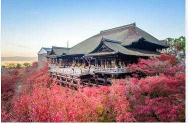 - Chùa Kiyomizu – ngôi chùa mang vẻ đẹp thuần khiết nổi tiếng nhất Kyoto, và được UNESCO công nhận là Di sản thế giới. Ngôi chùa thờ Phật Quan Âm nghìn tay nằm trên vùng cao ngọn đồi Higashiyama. Du khách thập phương kéo nhau về đây sẽ không khỏi ấn tượng bởi quang cảnh thiên nhiên có thể ngắm nhìn từ ngôi chùa đóng cột gỗ chênh vênh giữa lưng chừng núi. Phía sau tòa kiến trúc chính là Thác nước Otowa No Taki chảy xuống theo đường dẫn thành 3 dòng nước, tương truyền rằng uống nước ở cả 3 dòng của thác này sẽ Trường thọ, Khỏe mạnh và Thành công trong cuộc sống.