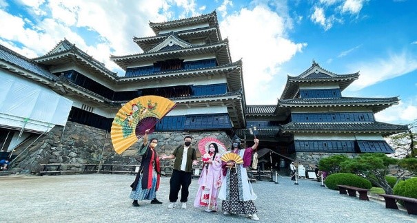 - Chiêm ngưỡng Lâu đài Matsumoto: còn được gọi là “lâu đài Quạ Đen” với kiến trúc 6 tầng độc đáo, đã hiên ngang đứng giữa trung tâm thành phố Matsumoto trong hơn 400 năm từ thời Chiến Quốc. Vào mùa xuân, khi hơn 300 cây hoa anh đào nở rộ quanh hào nước và trong vườn Honmaru, biến nơi đây thành "Bức tranh hoa anh đào" với kiến trúc "Hắc Thành" cổ kính và dãy Alps làm nền tuyệt đẹp.
