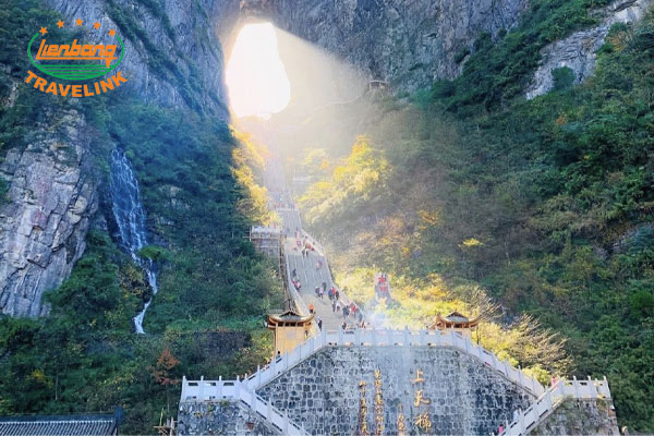 Sau khi vượt qua con đèo 99 khúc cua nguy hiểm, bạn sẽ đến được điểm tham quan đẹp mê hồn này. Cổng trời Thiên Môn Sơn là một kỳ quan thiên nhiên được hình thành từ hàng triệu năm trước, khi một trận đại hồng thủy làm sụp đổ một phần núi đá vôi, tạo ra một mái vòm khổng lồ giữa trời cao. Đây được coi là cửa ngõ giữa thiên đường và trần gian, với cảnh sắc huyền diệu và lãng mạn. Đứng giữa cổng trời, bạn sẽ có cảm giác như được hòa mình vào thiên nhiên, cảm nhận rõ mây trắng bay lượn xung quanh, gió nhẹ thổi qua tóc và ánh nắng rọi xuống như những tia hy vọng.