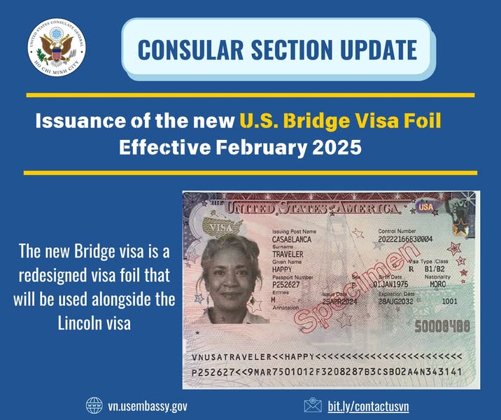 Đại sứ quán Hoa Kỳ tại Bolivia cũng ra mắt mẫu visa mới này. Tham khảo website của US Embassy in Bolivia https://bo.usembassy.gov/issuance-of-the-new-u-s-bridge-visa-effective-february-2025/